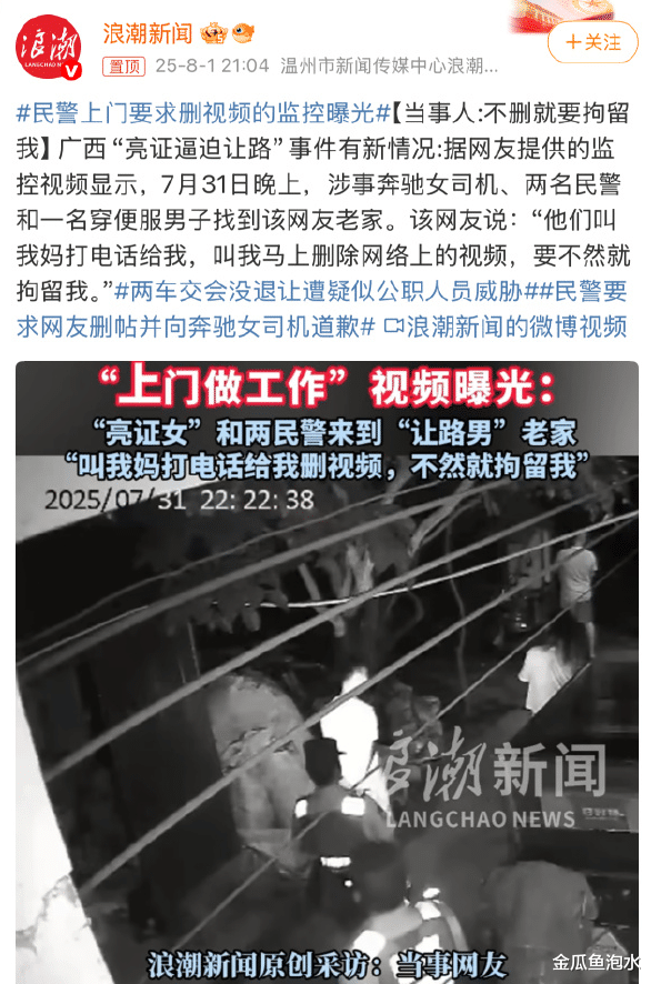 近日,广西防城港市上演了一出亮证逼迫让路的闹剧,当事人的遭遇可谓是波折不断。据网友提供的监控视频显示,7月31日晚,涉事奔驰女司机、两名民警和一名穿便服男子找到了这位网友的家。据当事人表示,他们不仅要求删除网络上的视频,否则就要面临拘留的威胁。此番上门要求,无疑给这位网友带来了不小的压力。